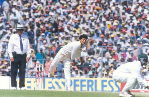 Saqlain made his international debut in September 1995 playing against Sri Lanka at Peshawar. He picked up four wickets at an average of 26.75 in the first test of the series. The highlight of his Test career came in the away series against India in January/February 1999, where he achieved his first ten wicket haul in a test match. In the first test, with India needing only 17 runs to win, Saqlain effectively sealed Pakistan's win by taking the wicket of Sachin Tendulkar who had scored 136. He ended the series with twenty wickets at an average of 20.15, which earned him the Man of the Series award.